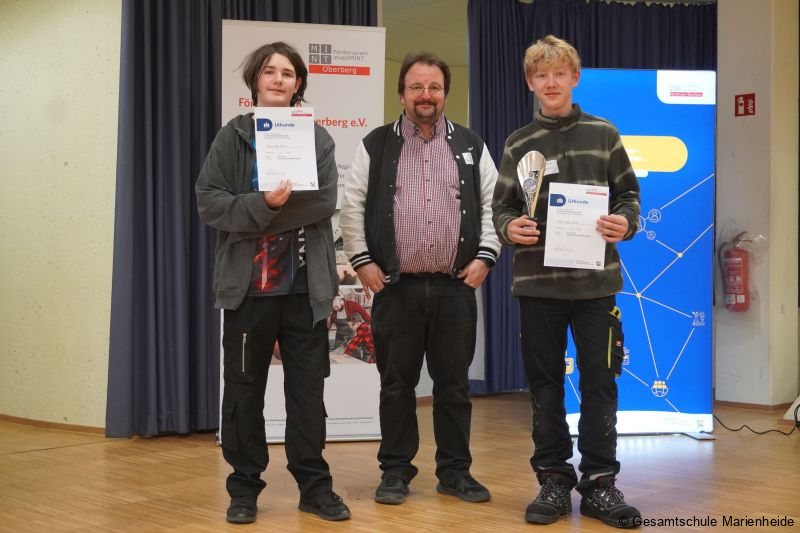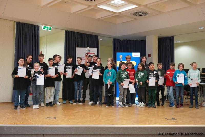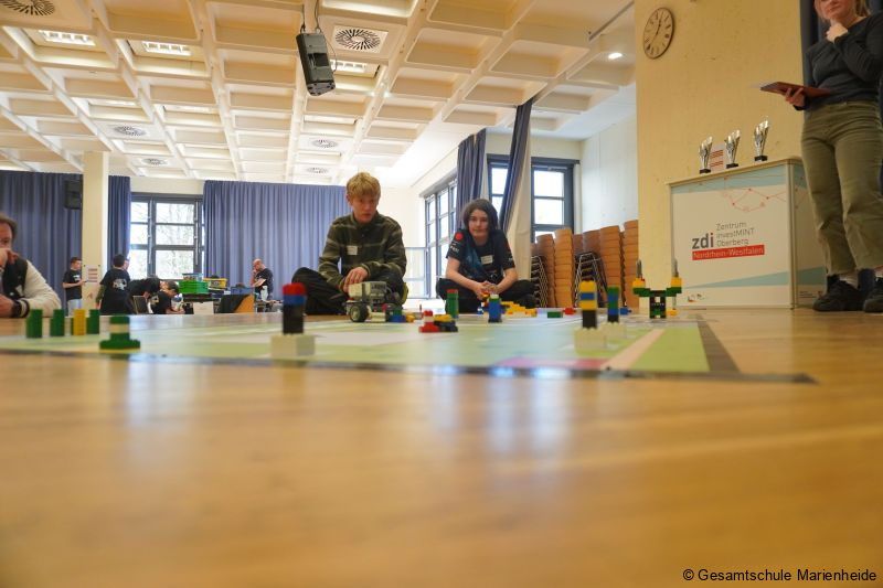 Premiere an der Gesamtschule Marienheide: Zum ersten Mal fand der Lokalwettbewerb „Robo-Games“ der MINT-Nachwuchsoffensive „zdi“ (Zukunft durch Innovation NRW, eine der weltweit größten Fördergemeinschaften für den MINT-Nachwuchs)) bei uns im PZ statt. Fünf Mannschaften sind zum Wettbewerb angetreten, darunter das Bonhoeffer-Gymnasium Wiehl mit zwei Mannschaften, das Engelbert-von-Berg-Gymnasium Wipperfürth und das Collegium Josephinum aus Bonn sowie wir selbst als Gastgeber, alle mit jeweils einer Mannschaft. Bei Mannschaftsstärken zwischen 5 und 13 Schülern sind wir mit der kleinsten Mannschaft bestehend aus exakt zwei Schülern, nämlich Silas Köster und Keanu Fricke (beide aus der 9d) mit ihrem Coach Volker Sprenger, gestartet. Es war ein toller Tag mit toller Atmosphäre, denn die Robo-Games sind neben dem Wettbewerb auch immer ein Treffen gleichgesinnter Robotik-Fans, die trotz Wettbewerb wie eine kleine Familie sind, die sich mit Tipps, Bauteilen und interessanten Gesprächen austauschen. Man kennt sich und man schätzt sich. Inhalt des Wettbewerbs: Die Teams haben in drei Läufen jeweils 2,5 Minuten Zeit vorher bekannte Aufgaben mit selbst gebauten und programmierten Lego-Robotern zu fahren, das Ergebnis wird nach jedem Lauf gemeinsam mit dem jeweiligen Team durch eine Jury bewertet. Klingt zunächst einfach, birgt aber eine Menge von Unwägbarkeiten und Tücken. Der schlechteste Lauf wird gestrichen, zwischen den Läufen kann verbessert und optimiert werden. Das traditionell starke Bonhoeffer-Gymnasium konnte sich – schon fast erwartungsgemäß – die ersten beiden Plätze und so die Teilnahme in die nächste Runde sichern, aber unsere kleine Mannschaft konnte sich einen respektablen dritten Platz erspielen. Die Kombination aus Ideenreichtum, Nervenstärke und dem nötigen Quäntchen Glück haben letztendlich gereicht. Glückwunsch an Silas und Keanu für diese großartige Leistung!