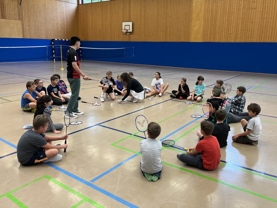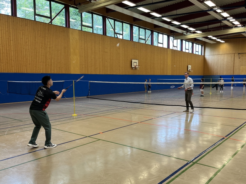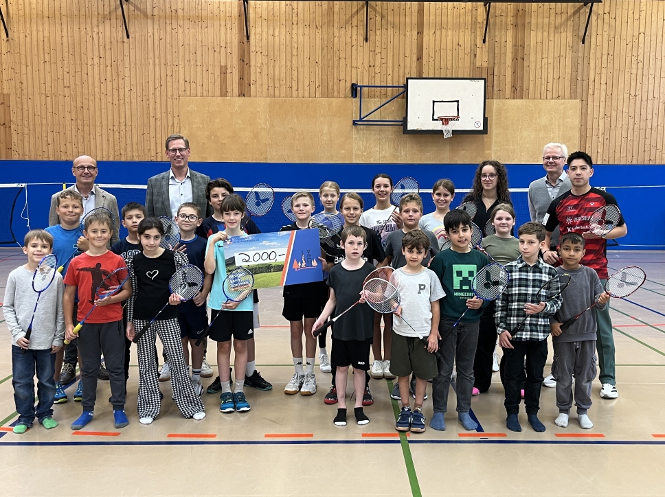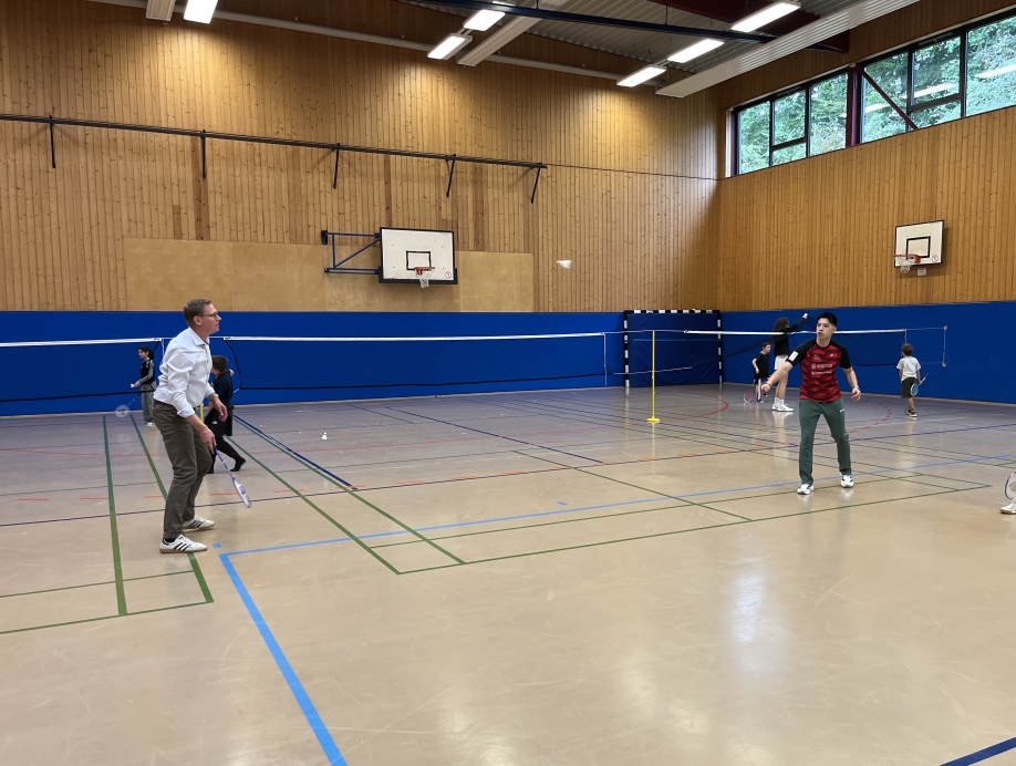 Am 17.09.2025 besuchte der Vorsitzende der Marienheider Bürgerstiftung und zukünftige Bürgermeister von Marienheide Sebastian Heimes die Badminton-AG an der Gesamtschule Marienheide. In Erinnerung an die erste Unterstützung vor gut einem Jahr hatte er einen symbolischen Scheck dabei und avisierte gegenüber den anwesenden Schulleitungsmitgliedern Christoph Straube und Anna Zeiler sowie Projektbetreuer Wolfgang Krug eine zukünftige Unterstützung des Projektes, die auch zwingend notwendig ist, wenn die Anschubfinanzierung durch die Hans Hermann Voss-Stiftung ausläuft. Sebastian Heimes zeigte sich besonders davon angetan, dass in der AG nicht nur Gesamtschüler*innen den Badmintonschläger schwingen, sondern auch Schüler*innen der beiden Marienheider Grundschulen. Er ließ es sich nicht nehmen, selbst zum Schläger zu greifen und einige Ballwechsel mit Trainer Samuel Hsiao zu absolvieren, während Juniorassistenztrainerin Hannah Müller die AG-Mitglieder weiter betreute.