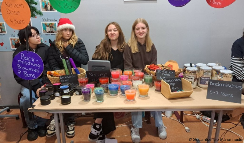 Gelegenheit zur Information boten zahlreiche Stände über die Oberstufe, über den Schüleraustausch, die Schülervertretung, den Förderverein, das Medienbegleitprojekt, die MINT-Klasse, das Gemeinsame Lernen und vieles mehr. Aber man konnte auch Selbstgebasteltes zur Weihnachtszeit, hausgemachte Backmischungen, selbstgemachte Marmelade des Abiturjahrgangs Q2 o.Ä. mit nach Hause nehmen.