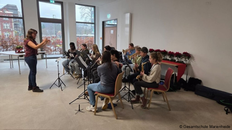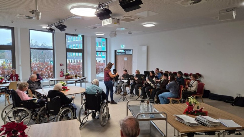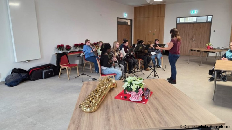 Zu Beginn der Adventszeit erfreute die MAMBA mit Weihnachtsliedern ca. 35 Senioren des Seniorenzentrums St. Elisabeth in Gummersbach. Zu Beginn der ersten Pause in der Gesamtschule Marienheide wurden Notenständer, Instrumente und Notenhefte eingepackt und in Kolonne fuhr die MAMBA nach Gummersbach. Dort angekommen, wurde die Musikerinnen und Musiker von den ersten Einwohnern bereits sehnsüchtig erwartet – die Vorfreude war riesig. 40 Minuten dauerte das stimmungsvolle Weihnachtskonzert der MAMBA, das aus traditionellen Weihnachtsliedern bestand, die die Zuhörer sehr gut kannten und laut mitsingen konnten. Belohnt wurden die MAMBA-Mitglieder zum Abschluss mit Schoko-Nikoläusen, worüber sich alle sehr freuten.