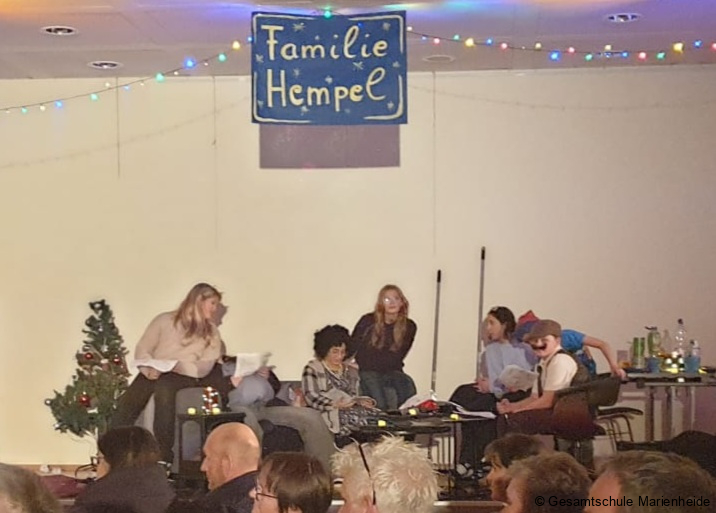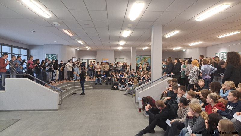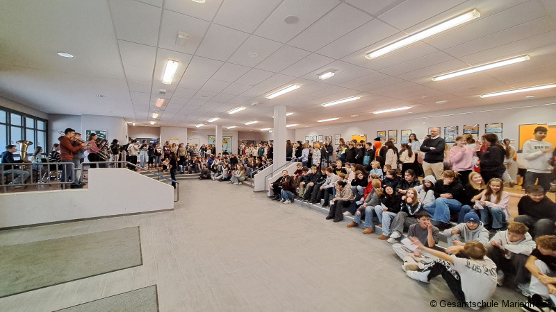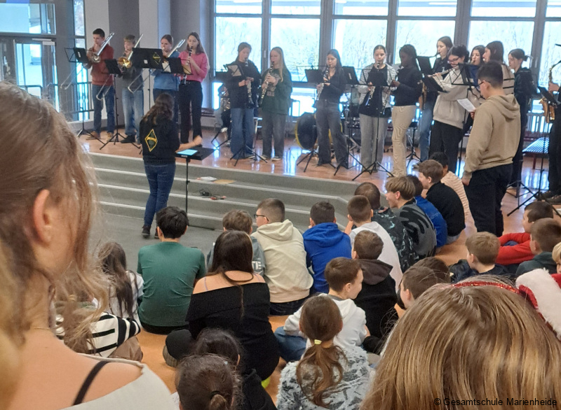 Kurz vor Beginn der Ferien gab es für Lehrerinnen und Lehrer sowie Schülerinnen und Schüler ein mittlerweile fast schon traditionelles Highlight in der Gesamtschule Marienheide. Zu Beginn der 5. Stunde versammelten sich mehrere Klassen im Foyer vor dem PZ, wo die MAMBA bereits aufgebaut hatte. Zur Einstimmung auf die bevorstehenden Ferien fand hier das Weihnachtsflurmusizieren der MAMBA für die Abteilung 1 statt. Nachdem die MAMBA „A Rocking Christmas“ zur Einstimmung vorgetragen und alle bereits mitgesummt, gepfiffen oder geklatscht hatten, wurde mit allen Anwesenden gemeinsam Musiziert. Zunächst sagen alle mit der MAMBA das allseits bekannte Lied „Oh du fröhliche“. Im weiteren Verlauf der Veranstaltung stieg der Schwierigkeitsgrad, denn es wurden die heutzutage seltener gesungenen Weihnachtsklassiker „Zu Betlehem geboren“ und „Tochter Zion“ angestimmt. Dank der Liedblätter konnten viele Schülerinnen und Schüler diese Lieder gut kennen lernen. Beim Abschlussstück war die Stimmung ausgelassen und es wurde lauthals mitgesungen – Last Christmas hat sogar den letzten Singmuffel zum Mitmachen angeregt. Denselben Ablauf gab es im anderen Gebäude noch einmal für die Schülerinnen und Schüler der Abteilung 2 vor dem Schülercafé auf dem Flur. Highlight dieses Jahr war der dritte Auftritt für die MAMBA an diesem Tag. Die Sekretärinnen und die Schulleitungsmitglieder wurden zum Abschluss einen gelungenen Weihnachtsflurmusizierens vor dem Sekretariat mit Weihnachtsmusik beglückt. So wurden an der Gesamtschule Marienheide musikalisch die Weihnachtsferien mit guter Stimmung bei weihnachtlicher Atmosphäre, viel Gesang, Instrumentalmusik und guter Laune eingeläutet.